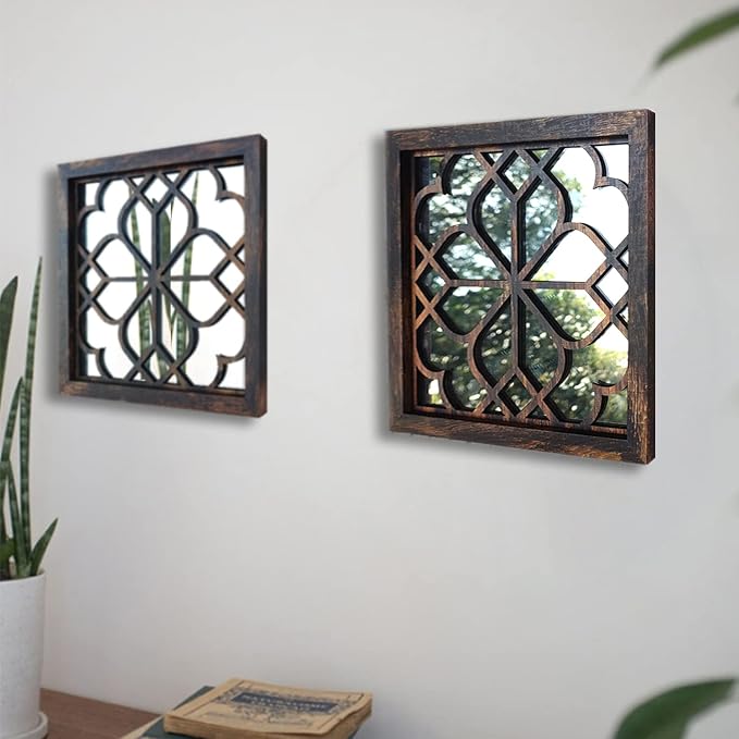 - NICE SIZE:This is square modern mirror,Its size is 12”x12”.This is a Very well design, solid and looks great.This mirror really adds some sophistication to the rustic vibe.It's a modern wall decor gift and goes well with any decor.