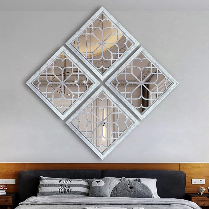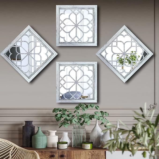 Wocred Set of 4 Mirrors Square Wall Mirror,Gorgeous Rustic Farmhouse Accent Mirror,Rustic White Color Entry Mirror for Bathroom Renovation,Bedrooms,Living Rooms and More(12”x12”4pcs)