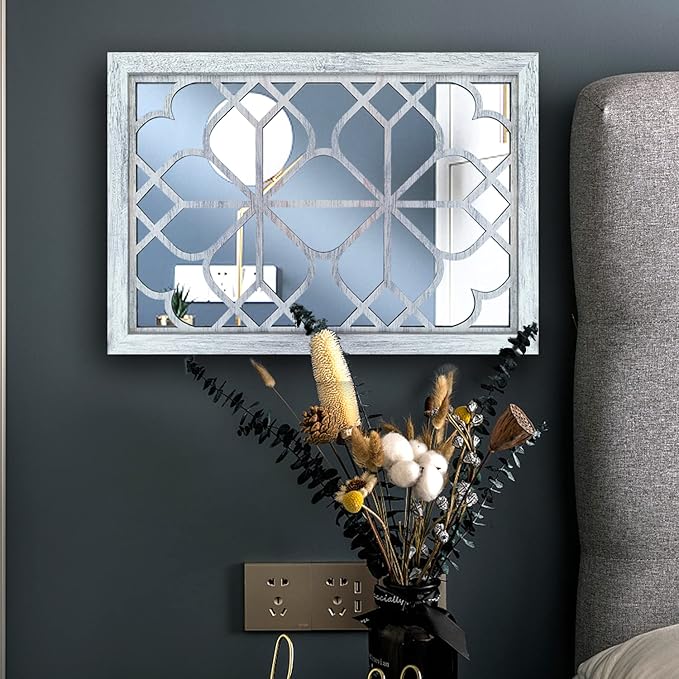 - DECORATIVE ACCENT :This chic mirror is handmade and is combined with the beautiful fine carved shape in the middle to make a perfect decorative mirror.It consists of MDF wood frame, 3mm mirror, exquisite carvings, and a back panel.It is stylish and very attractive and can fit in traditional or modern decor.