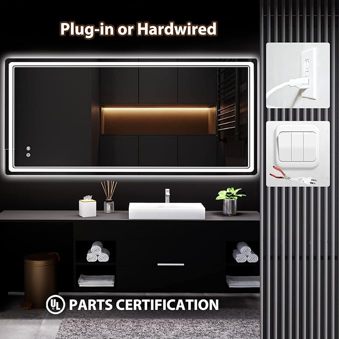 - 【Long service life, easy installation】 This bathroom vanity mirror is of high quality. The power supply and LED lights are UL certified and have a service life of more than 50000 hours. Our led vanity mirror support normal wall switch control and can be connected using plugs or hardwired.