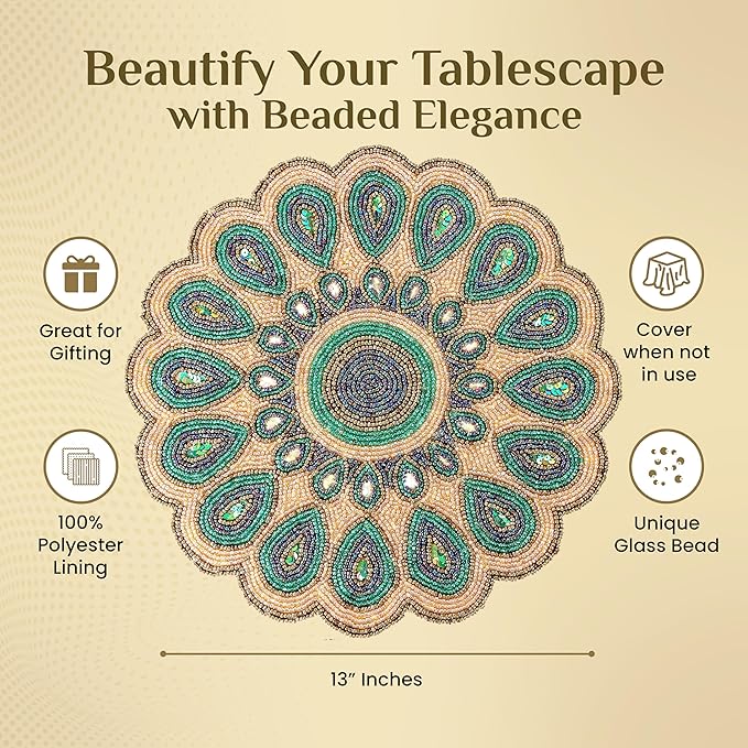 13" Round Beaded Table Mat - Elegant Glass Bead & Polyester Charger Plate for Dining & Coffee Tables, Non-Slip, Stain-Resistant, Perfect for Home & Special Occasions (Green Gold Brown) - CLEENTABLE