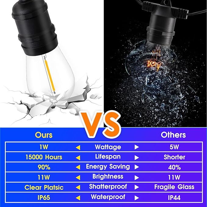 - 【Weatherproof&Shatterproof】Edison light string can create a romantic atmosphere for you, which can bear sun, wind, rain, snow or other extreme temperature during outdoor using. S14 plastic bulbs are shatterproof and durable