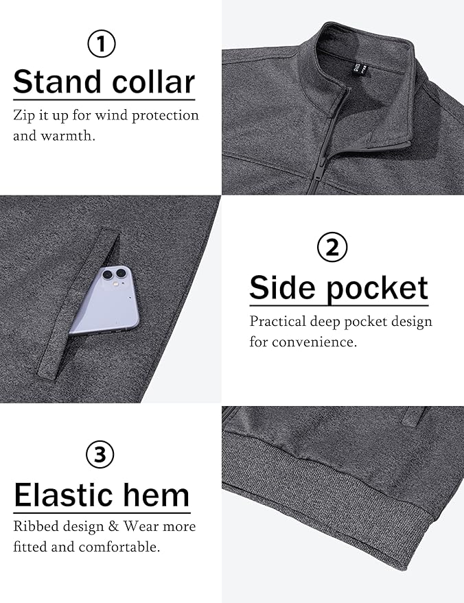 • FULL-ZIP: Full Zip Jackets make it easy to adjust your temperature in daily wear. The zipper can not slip down by itself when fixed on the track.