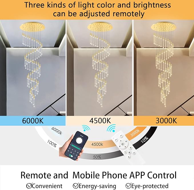 - Remote Dimmable Chandeliers - Crystal chandelier comes with LED dimmable bulbs and dimmer, you can control the light from 2700K warm light to 6000K white, and adjust the brightness from 5% to 100%, freely adjusted by remote controller any where (This chandelier has own dimmer and transformer, please do not use with any dimmer switch and dimming system !)