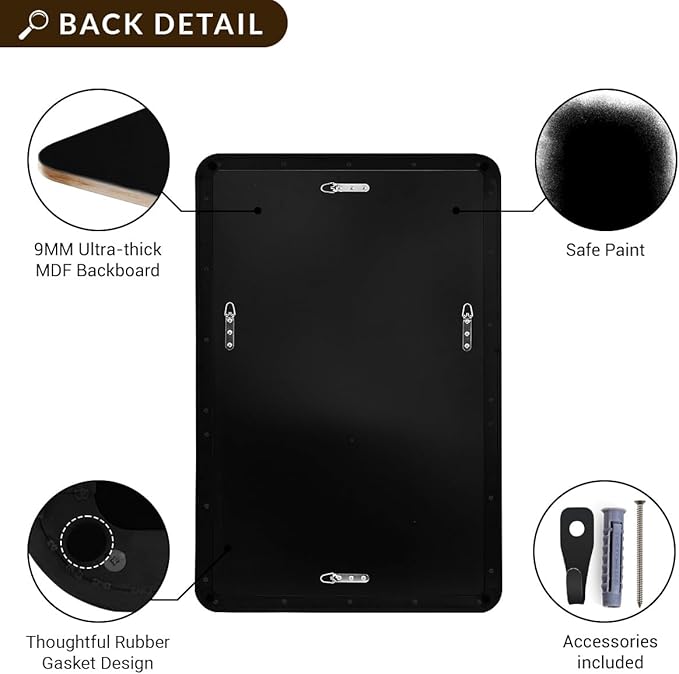 - PREMIUM QUALITY MATERIAL: (NW:38.80LBS) This 48x30 mirror is made of the iron metal with oxidation-resistant to be rustproof. 4mm HD glass supported by 9mm MDF backboard to be shatterproof. The matte black finish with the tube framed makes the difference and the gorgeous of this rounded rectangle mirror. The beauty cannot be found in any alloy frame mirror