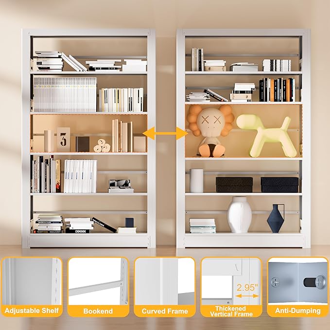5-Tier Bookshelf, White Bookshelf with Adjustable Storage Shelves, Metal Bookshelf, 69" Tall Bookcase for Living Room, Library, Office, Bedroom, Including Book Stopper,36" Wide Bookshelf