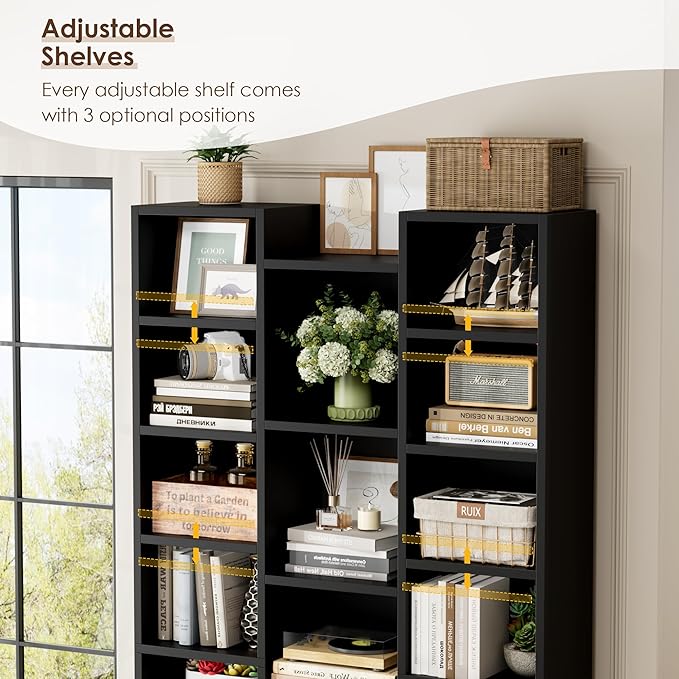FOTOSOK 71'' Tall Bookshelf, Triple Wide Black Bookshelf with Adjustable Shelves, 8 Tier Media CD DVD Storage Tower Rack, Diaplay Cabinet Shelf, Cube Storage Organizer Shelf for Home Office, Black