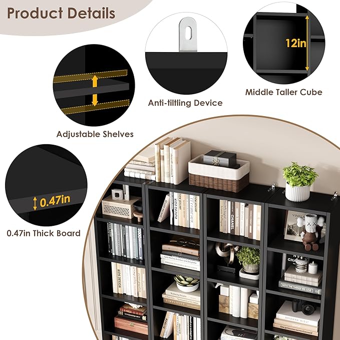 - Larger capacity, more possibilities. This media tower Rack is composed of 21 cubes in total which can store and display most of your CD DVDs and any decorations. The middle part of the black bookshelf is wider and taller which can flexibly suit more storage volume needs.