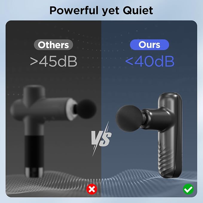 - User-Friendly Design and Long-lasting Performance: Designed for ease of use, Penjoy mini massage gun features a lightweight and durable body with a T-grip for easy access to the lower back, ensuring instant relief from back pain. With low noise levels ranging from 35dB to 40dB, it's suitable for use in any environment without causing disturbance. Additionally, the 10-minute auto-off feature enhances safety, while the long-lasting battery ensures extended use, making it the perfect travel companion for muscle relaxation anytime, anywhere