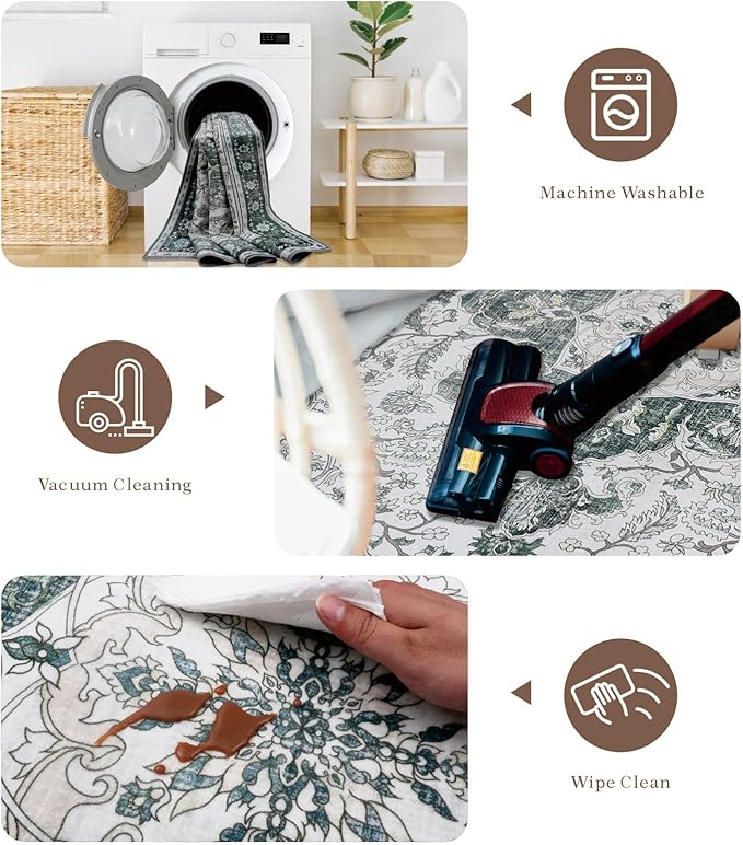 8x10 Boho Washable Area Rugs for Large Living Room Machine Washable Rug Stain Resistant Non-Slip Backing for Bedroom, Soft Vintage Area Rug (Green,8x10ft)