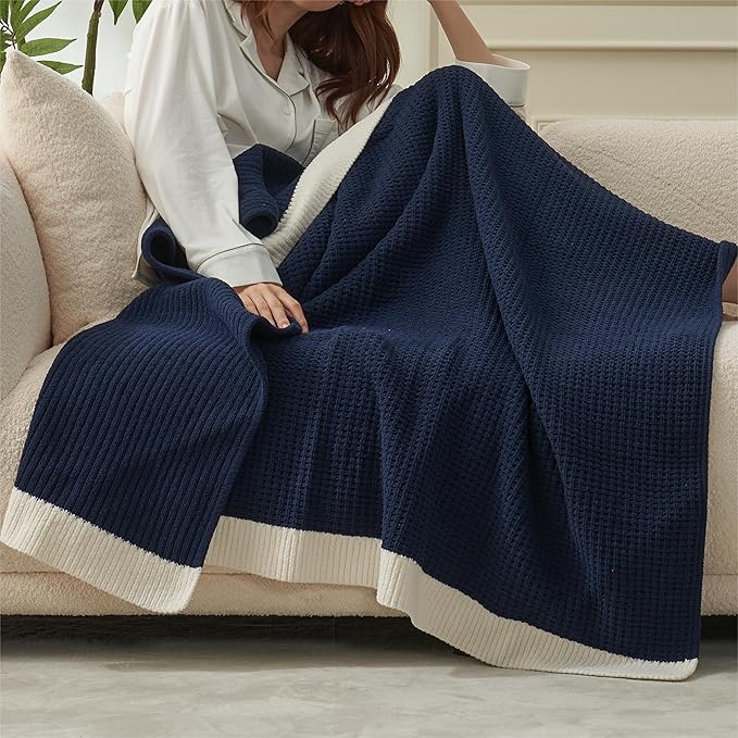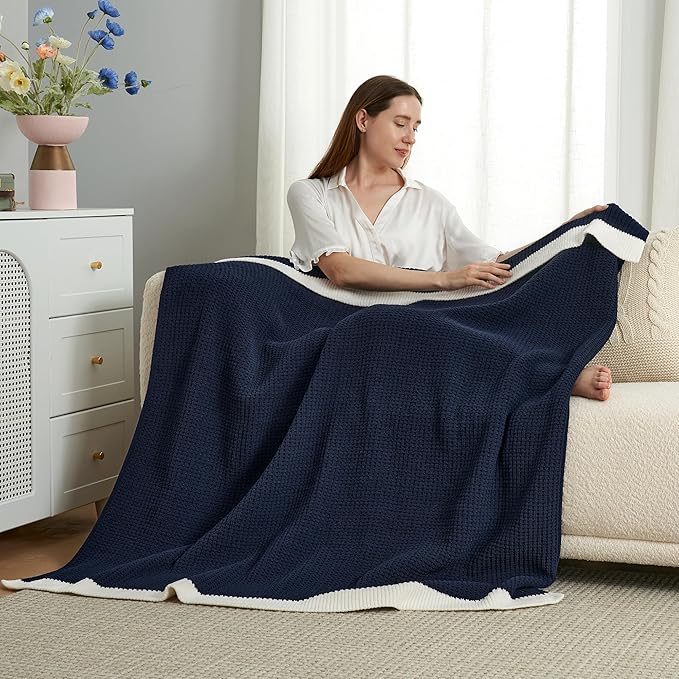 - Classic Waffle Weave: This crafted knit throw blanket showcases classic waffle knit that feels cozy and breathable. Stand out with our throw blanket's contrast edge design, adding a modern and fashionable touch to your home decor.