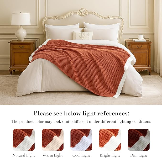 - Classic Waffle Weave: This crafted knit throw blanket showcases classic waffle knit that feels cozy and breathable. Stand out with our throw blanket's contrast edge design, adding a modern and fashionable touch to your home decor.