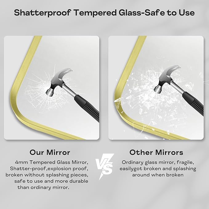 - Excellent Design: Minuover's gold bathroom mirror is designed with a kind of fashion and modern industrial style. The frame is made of brushed gold metal with an angled design to protect the mirror. Besides, the gold bathroom vanity mirror is anti-stripping, anti-cracking and anti-water