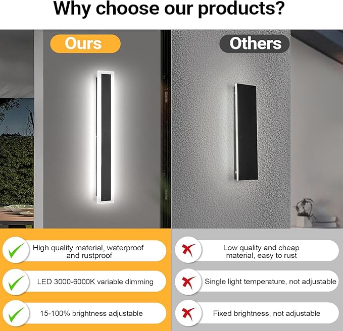 - 【Waterproof Safety】 This Linear Exterior Wall Light adopts IP65 waterproof grade, good dustproof and waterproof performance, ensuring that the wall lamp can withstand bad weather. This allows the linear outdoor wall light to work normally in a variety of areas such as courtyards, balconies, stairs, garages, doorways, porches, terraces, gardens, etc