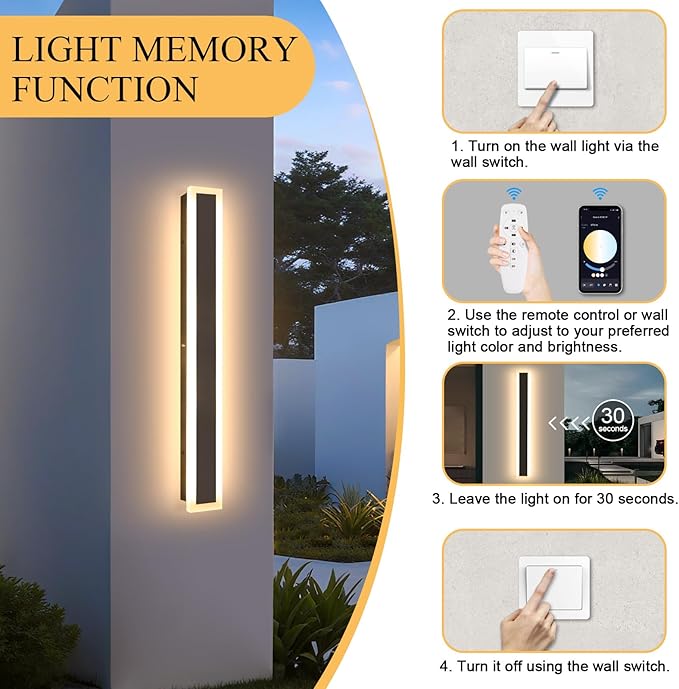 - 【Adjustable Light】This outdoor wall light can be easily adjusted according to your different needs in terms of brightness (15% - 100%) and color temperature (3000K - 6000K) with the remote control that comes with the product. Please note that we don't provide batteries for the remote control, you will need to purchase your own