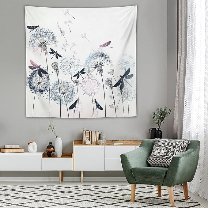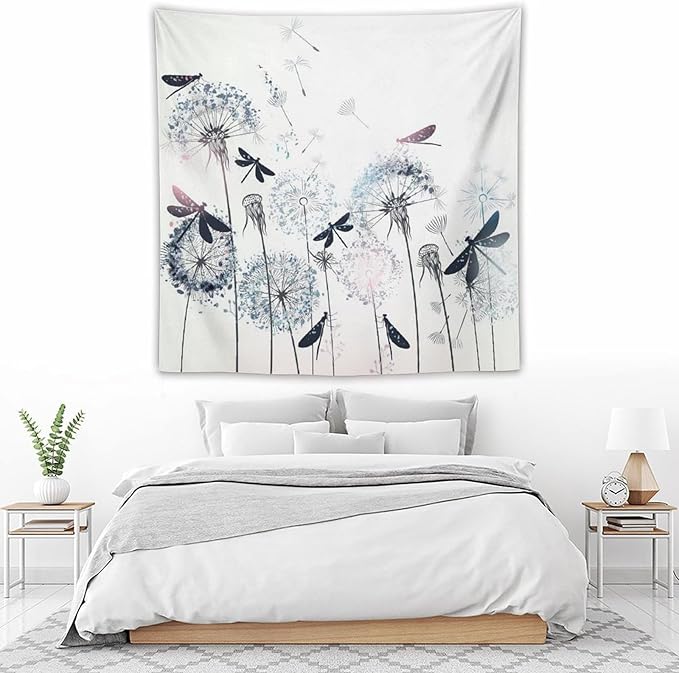 Kurtect Dandelion Tapestry,Rustic Dragonfly Teal Blue Floral Theme Pattern Print Tapestries for Living Room Party Beach Picnic Blankets Tablecloths Wall Decor, 60x60 in