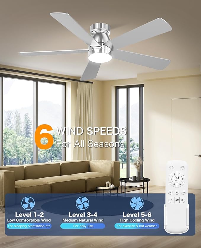 - Ceiling Fans with Remote: With six air speed settings and three timer settings (1H/4H/8H), this ceiling fan operates quietly, so you won't be disturbed while sleeping or working. The volume is low to 35dB when the fan is running, like the sound of falling leaves, or like a butterfly flaps its wings(30dB). With the remote control, you can adjust all the settings from anywhere in the room.
