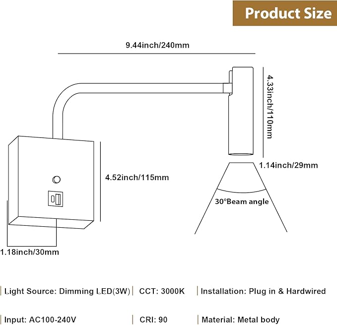 - 5-100% DIMMABLE - The reading light is controlled by two touch switches, Just click once to turn on/off the wall light, long press to adjust the brightness you want, get the right brightness for reading, working, leisure, and sleeping.