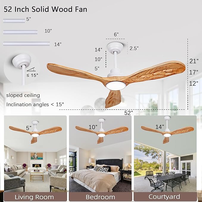 - ◆ Wood Fan Blade Ceiling Fan: The ducrew 52" ceiling fan has three natural tung walnut-colored wood fan blades that are finely carved. It's available with a choice of 5-inch, 10-inch and 14-inch extensions, allowing you to choose the optimal height for your space, with an overall height from ceiling to base of 12 inches, 17 inches or 21 inches. It can also be installed at a 15-degree tilt.