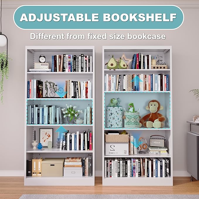 - 【Adjustable Shelves】This 5 Tier bookcase has four adjustable shelves.You can adjust the height according to the storage level.As a white bookshelf, this is our very distinctive design.You can also use this bookshelf as a 6-layer book shelf, and the top can also put your favorite books.