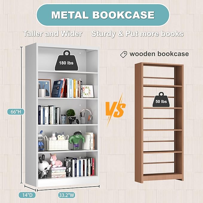 - 【Sturdy and Stable Metal Bookcase】This is a metal bookshelf, not a wooden shelf.It can hold much more weight than a wooden bookshelf.As a metal bookshelf, it has a longer service life and no pollution.Each shelf can hold up to 180 pounds.