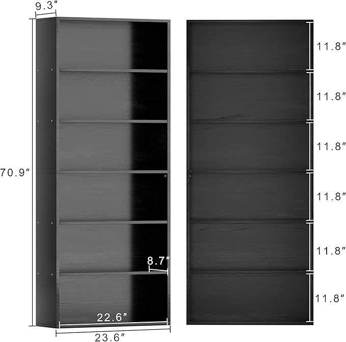 - 6 Tier Bookshelf: This 6-tier bookshelf sized 9.3”D x 23.6”W x 70.9”H, the simple upright and open design of tall bookshelfs can help you save more space in your house. This bookshelf can be used as a storage organizer and display stand