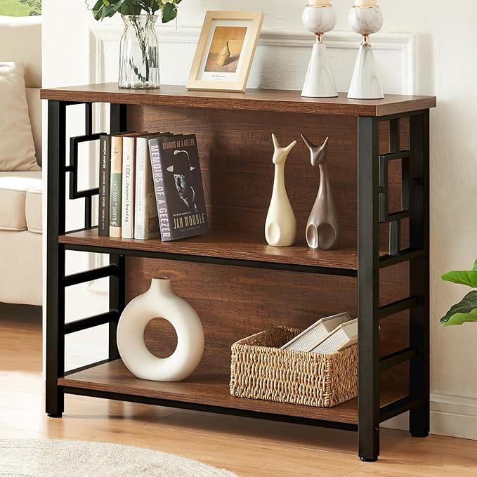 HOMISSUE Book Shelf, 3 Tier Deep Bookshelf with Storage, Engineered Wood and Metal Shelf Bookcase, Low Short Bookcases for Small Space, Living Room, Bedroom, Office, Rustic Brown