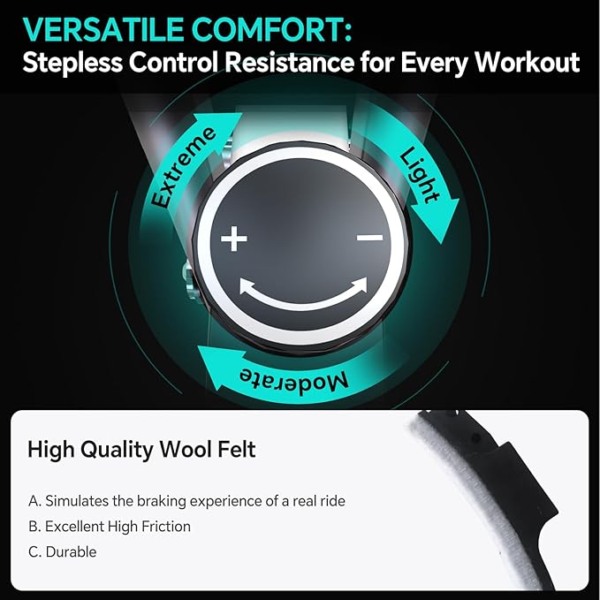- STEPLESS CONTROL RESISTANCE: The stationary bike for home features a stepless variable resistance system, allowing for a seamless transition from low to high resistance. Complementing its efficiency, we've incorporated premium wool felt brake pads, renowned for their exceptional durability. These woolen brake linings not only provide reliable stopping power but also contribute to a quieter, more comfortable riding experience.