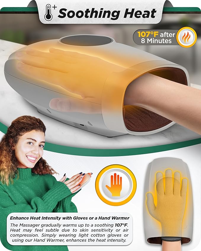 - Experience targeted relief with our advanced hand massager, specifically engineered to alleviate finger numbness and joint pain. The LX7 features a customizable heat setting that gradually increases to a soothing 107°F, providing gentle warmth from the top of the device, making it ideal for sensitive hands. For a more pronounced heat sensation, consider wearing thin gloves. The LX7 provides a gentle yet effective therapeutic experience, ideal for daily relaxation and recovery.
