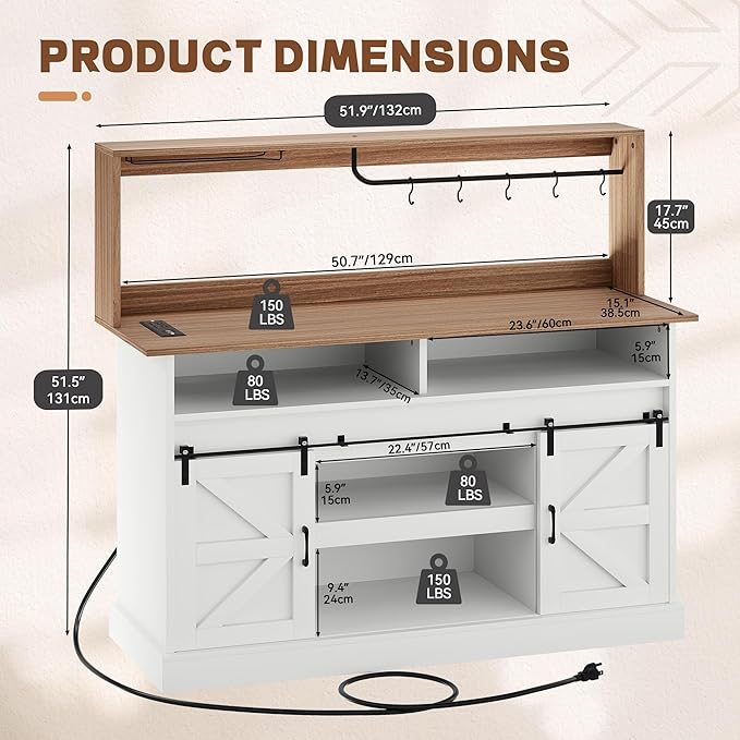 YITAHOME 52" Farmhouse Coffee Bar Cabinet with Storage, Buffet Cabinet with Goblet Holder, 5 Hooks, Power Outlets, Sideboard Cabinet with Sliding Barn Doors for Kitchen & Living Room (White)