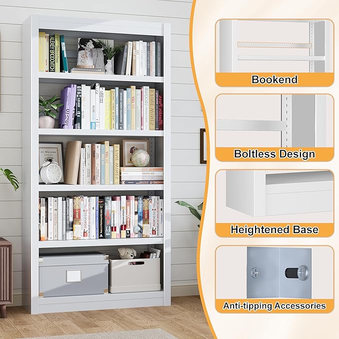 - 【Secure Office Bookshelf】Each layer of the 5 shelf bookcase is equipped with a bookend to ensure that books and items will not fall off, and is also equipped with an anti tipping device to ensure the safety of family members, making it an ideal choice for homes