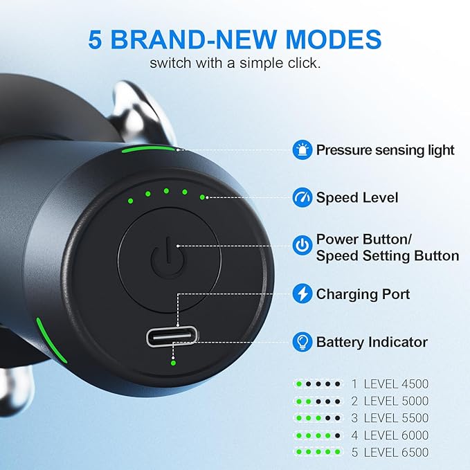 - Easy to use:No need to switch attachments—this portable therapy massage gun integrates 5 heads and offers 5 adjustable speed settings, allowing you to adjust intensity for different muscle groups. The deep tissue trigger point massage is the ideal massage tool for relieving tension in areas like the lower back