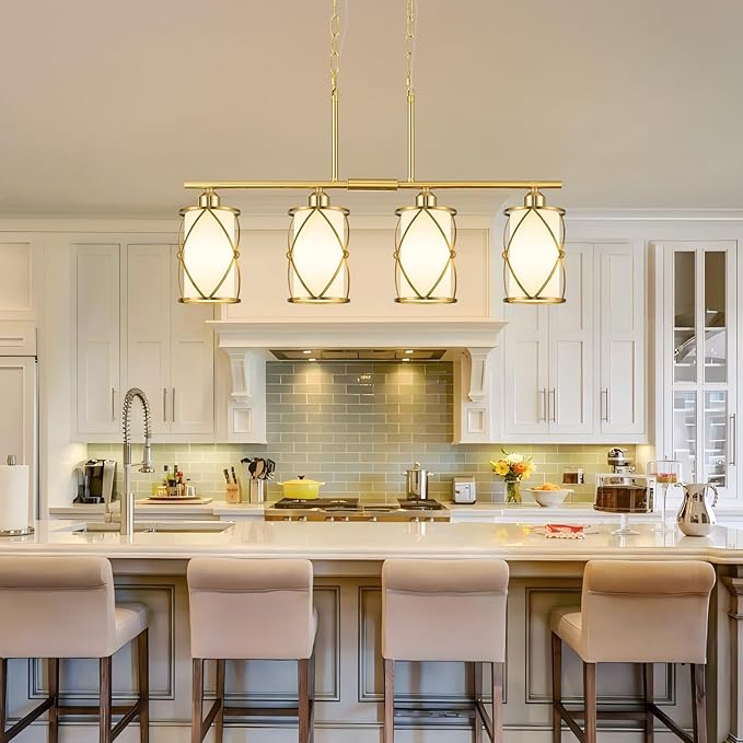 4-Light Kitchen Island Lighting, Brushed Gold Linear Dining Room Light Fixtures with Milk Glass, Modern Industrial Chandelier Pendant Light for Kitchen Island Dining Room, CH9176BGW-4IS