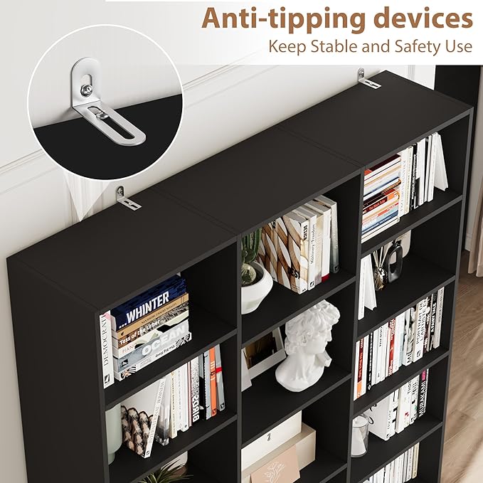 - Triple Column 6 Tier Bookshelf : With 17 open shelves, this black bookshelf offers plenty of room to store everything from books and DVDs to storage boxes and decorative pieces. You can keep your living space tidy and clutter-free with spacious storage capacity. Dimensions: 74'' H x 58.7'' W x 9.3'' D