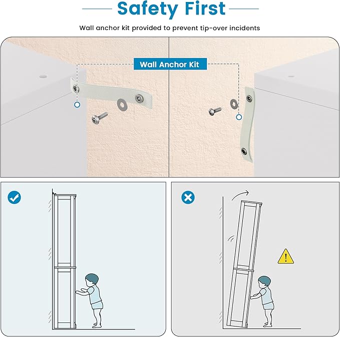 - Stable and Safe: The display case features a specially reinforced connection, ensuring enhanced stability. Equipped with anti-tip devices, it prioritizes safety. Store your items with ease and confidence, knowing that its reliability has been built to last