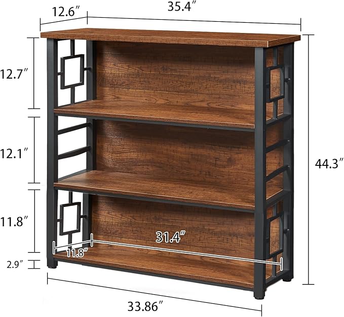 - Generous Storage Space: Featuring three spacious shelves, this rustic bookshelf offers ample room for books, plants, decor, and more, making it perfect for those who want to maximize their storage without compromising on style; Size: 35.4"W x 12.6"D x 44.3"H; The low bookcase is specially designed for small spaces, making it an excellent option for apartments or cozy homes
