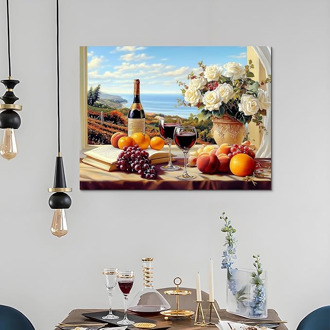 superbpag - Kitchen Still Life Canvas Wall Art, Fruit Grapes Wine Bottles Food Dining Room Wall Art, Contemporary Kitchen Vintage Canvas Print Oil for Living Room Home Decor 24x18 Inch