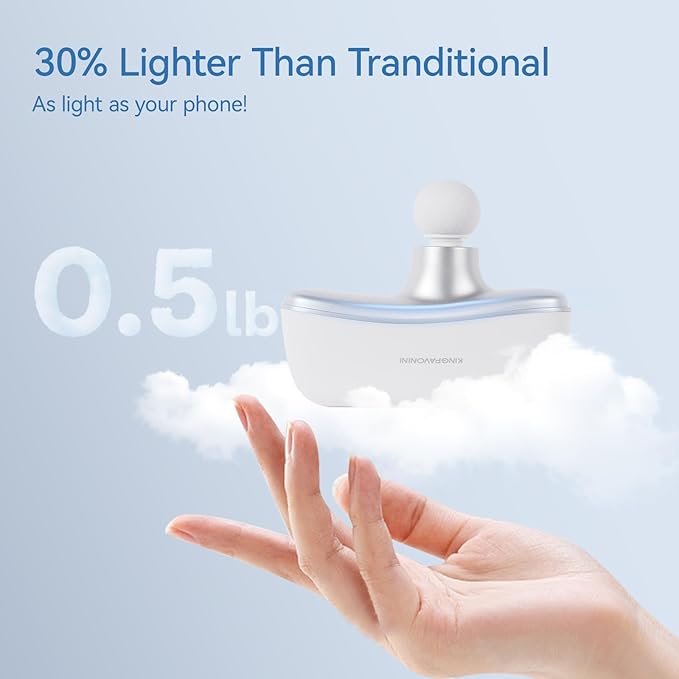 - [Pocket-Sized & Featherlight] Smaller than your phone (4.9" tall) and lighter than your morning coffee (0.5lbs), KingPavonini muscle massage gun slips effortlessly into crossbody bags or jacket pockets; easy to hold and carry, the ergonomic grip fits your hands, delivering comfortable massage without wrist strain