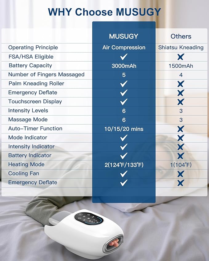 - 【360° Air Compression for Gentle Full-Hand Comfort】Traditional massagers often rely on rigid shiatsu nodes that press into fixed points. MUSUGY uses 360° air compression that inflates and deflates from fingertips to wrist—creating gentle, wave-like pressure that’s evenly distributed and joint-friendly. Ideal for daily relief after typing, crafting, or gaming.