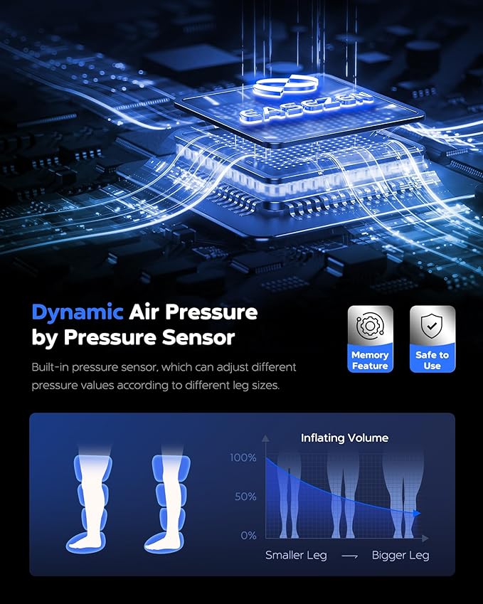 - 【Smart Leg Massager】With advanced intelligent pressure sensors, our air compression boots adjust pressure intensity according to your unique leg size, prioritizing safety and reliability. Featuring a memory function to store your preferred settings, our leg compression massager is user-friendly, especially for the elderly. Experience personalized comfort and convenience with every use.