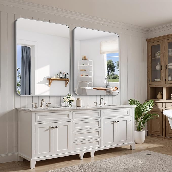 FORBATH 40x48 Inch Silver Bathroom Mirror for Over Sink, Large Rectangular Wall Mirror with Metal Frame, Rounded Corners for Bathroom, Bedroom, Entryway Decor (Horizontal or Vertical)