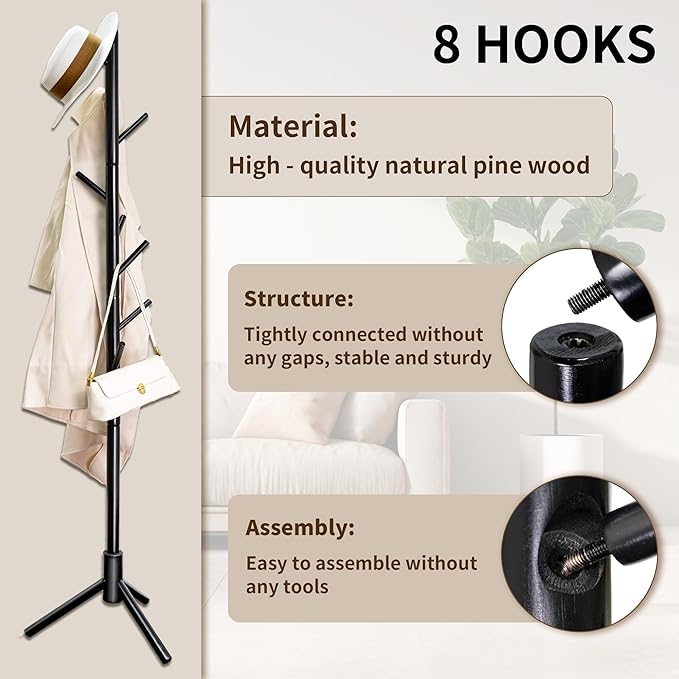 VaeFae Bamboo Coat Rack Stand, Free Standing Hall Tree with 8 Hooks (Black)
