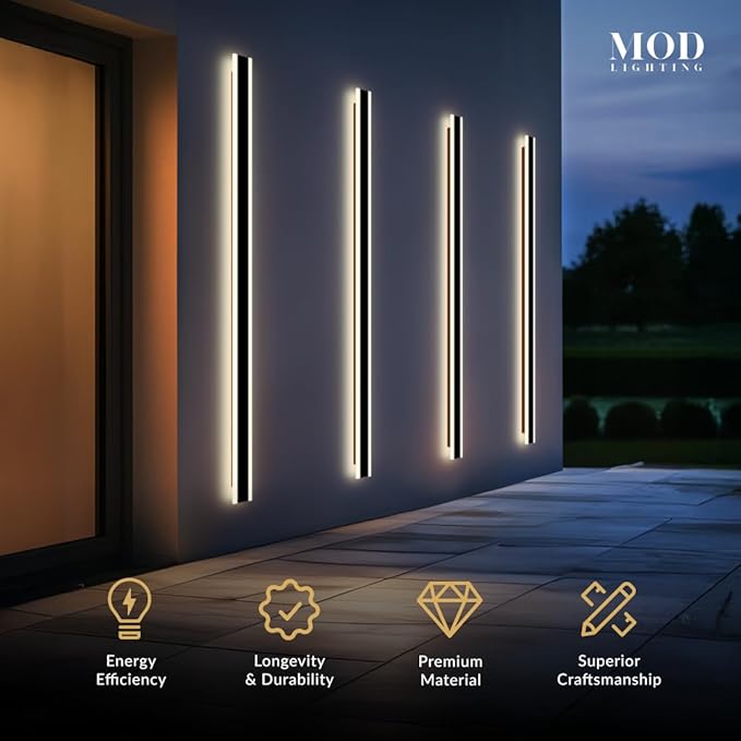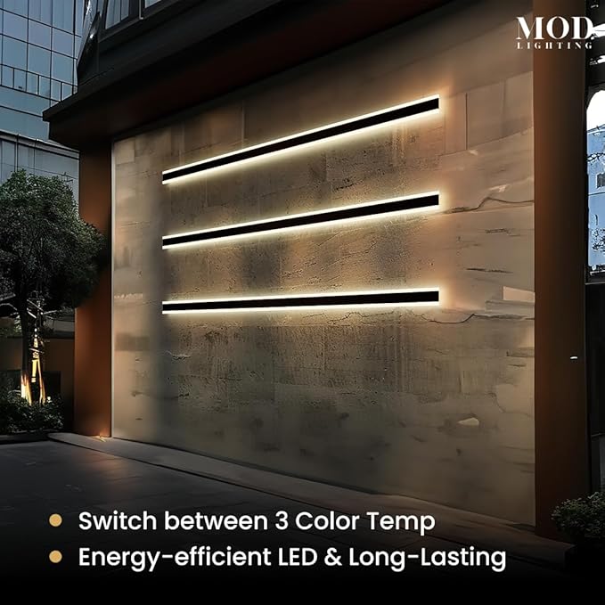 - 𝗪𝗶𝗱𝗲 𝗔𝗽𝗽𝗹𝗶𝗰𝗮𝘁𝗶𝗼𝗻: Long outdoor wall lights for House Front Door, Garage, Porch or Patio. Available in multiple sizes from 12 up to 94 inches can fit any space with the option to be synced to a single remote for convenience.