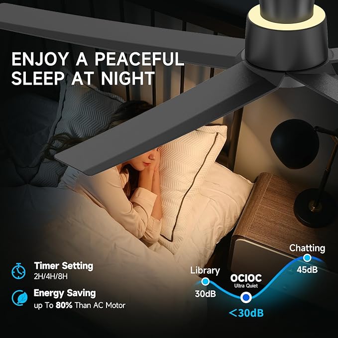 - Super Quiet and Energy-Efficient DC Motor: Our 52 inch ceiling fan with light features an A-grade energy-efficient DC motor, reducing power loss by up to 80% compared to traditional AC motors. The motor is crafted with industry-leading materials and a sleek black finish, ensuring ultra-quiet operation with noise levels under 30 dB. Enjoy silent, stable airflow and warm lighting without any disturbances, perfect for peaceful sleep or quiet activities.