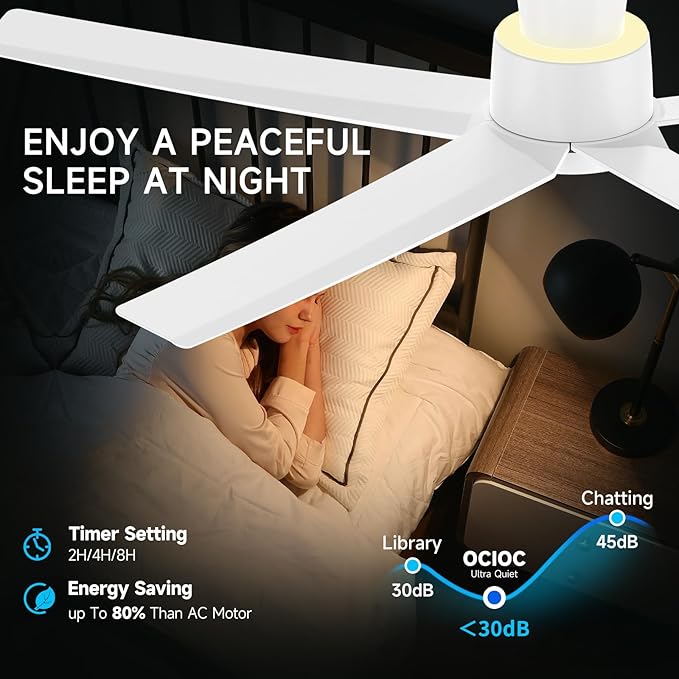 - Super Quiet and Energy-Efficient DC Motor: Our 52 inch ceiling fan with light features an A-grade energy-efficient DC motor, reducing power loss by up to 80% compared to traditional AC motors. The motor is crafted with industry-leading materials and a sleek black finish, ensuring ultra-quiet operation with noise levels under 30 dB. Enjoy silent, stable airflow and warm lighting without any disturbances, perfect for peaceful sleep or quiet activities.