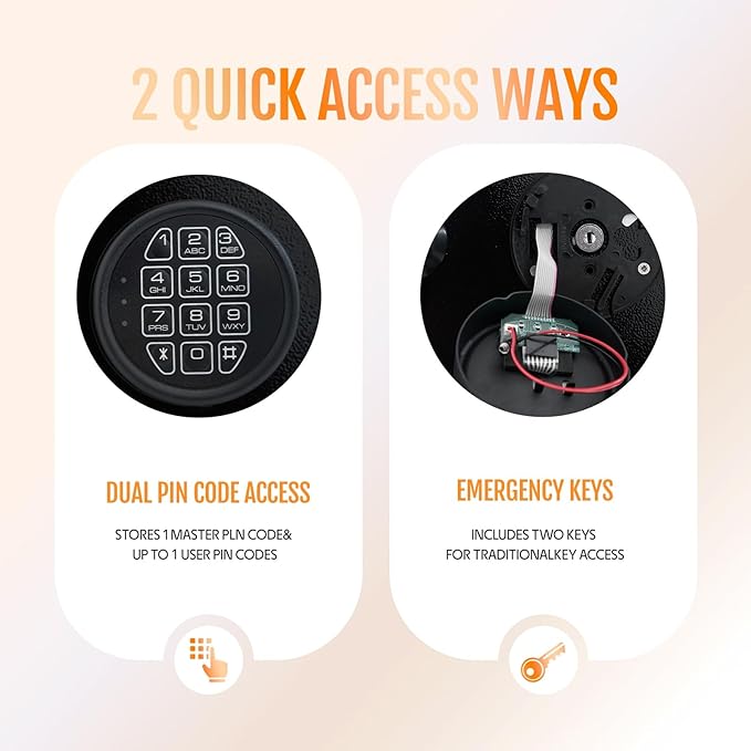 - [Features]: LED backlight panel + mute function + 120° door opening: 1. The LED backlight panel will light up automatically to help you enter the password; 2. Press 1 to turn on the mute function to provide you with safety protection in dangerous situations; 3. The 120° extra-large opening angle is wider than the old 90° safe opening, making it more convenient to take and put items; 4. The integrated metal handle is more sturdy and durable; 5. The felt lining is soft and scratch-resistant.