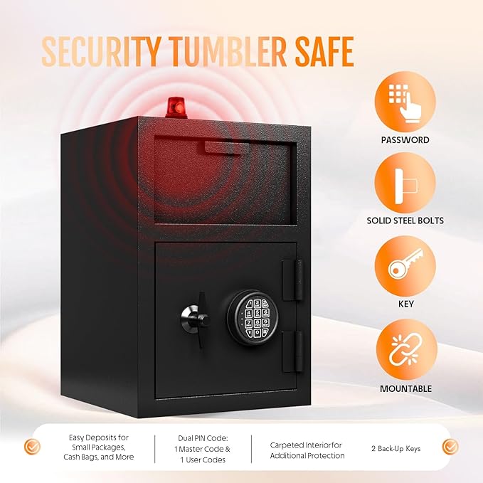 - [Drop Safe Box Anti-Fishing Design+Thickened Solid Steel Door] : Our safe drop box adapts a extra large Anti-fishing baffle. The deposit safe boasts a delivery port with a saw-tooth edge tilting baffle, even kids can't get their little fingers into this guy, enhancing security by preventing unauthorized access. 10mm door panel and 3 live-locking bolts (26mm diameter) that provide durable and reliable protection