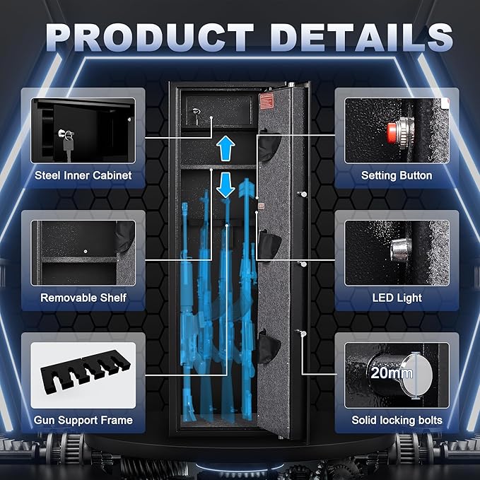 - 【Military-Grade Protection & Intelligent Alarm System】: Crafted from advanced alloy steel, this rifle gun safe features 3 thickened solid locking bolts and an anti-pry design for unrivaled durability. As a top-tier home gun safe, it's equipped with an intelligent alarm system: 3 incorrect PIN or fingerprint attempts trigger a 70dB alert, and the alarm also activates in case of violent shaking or attempted break-ins. This ensures maximum security for your rifles and shotguns against unauthorized access.