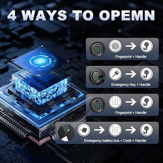 - 【Quick Access】: The rifle gun safe offers multiple quick access methods. You can unlock it using your pre-set PIN codes, recorded fingerprints, or keys. This ensures you can retrieve your guns within 5 seconds. It's a biometric rifle safe and a biometric gun safe in one. Additionally, an extra battery case is included, ensuring you can still access the safe even if the inserted batteries die