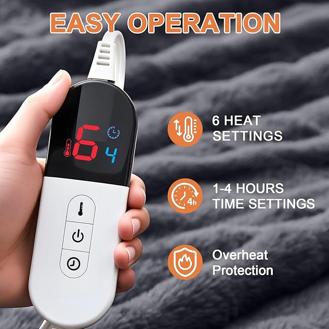 - Customizable Warmth: Stay warm and cozy with our electric blanket, featuring 6 heating levels ranging from 68–122°F. The handy controller allows you to easily adjust the warmth to your preference, delivering tailored comfort for any occasion. Whether you prefer gentle warmth or toasty heat, our heated blanket has you covered